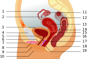 Appareil génital féminin : 1. Trompes de Fallope 2. Fimbria 3. Vessie 4. Symphyse pubienne (os pubien) 5. Glande de Skene 6. Urètre 7. Clitoris 8. Bulbe du vestibule 9. Petite lèvre 10. Grande lèvre 11. Ovaire 12. Colon sigmoïde 13. Utérus 14. fornix 15. Col de l’utérus (cervix) 16. Rectum 17. Vagin 18. Anus 19. Glande de Bartholin