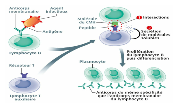 Parmi les lymphokines sécrétées par les LT4, certaines vont stimuler la différenciation d’une partie du clone de LB en plasmocytes, cellules sécrétrices d’anticorps circulants.
